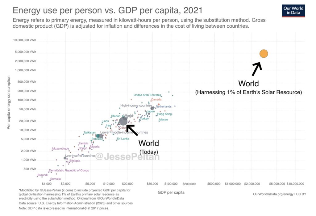 Uno de los gráficos más visionarios que aportas muestra el escenario hipotético de un mundo que aprovecha solo el 1 % de la energía solar que llega a la Tierra. El resultado: un salto de varios órdenes de magnitud en el PIB per cápita global y el consumo energético per persona.