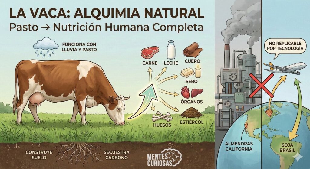 La comparación seduce por su simplicidad: pasto → nutrición humana completa. Para quienes la difunden, el rumiante actúa como un transformador químico y biológico que la industria no puede imitar. En esa narrativa, la vaca “produce” varios bienes a la vez: carne (proteína completa y grasa), leche (alimento denso en nutrientes), cuero (ropa y herramientas), sebo (cocina, jabón, velas), huesos (caldos, utensilios, fertilizante), órganos (alimento muy concentrado) y estiércol (fertilizante). Una suerte de economía circular portátil.